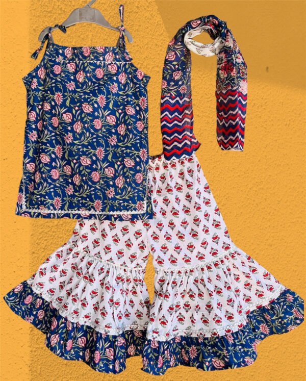 Dress up your doll with this beautiful piece. Ethnic printed kurta set features a spaghetti style kurti with a golden lace running in the front complemented with flowy sharara style pants. This graceful style will make her look gorgeous. It can be worn on festivals or family functions .