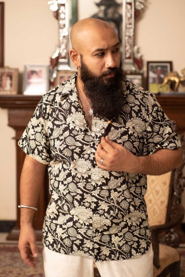 This stylish Inked Beige Cuban Collar Shirt is expertly crafted with 100% Handblock cotton and a beige floral print on a black background. Perfectly suited to your next events, the Cuban style collar and subtle Tones ensures you look sharp and on trend.