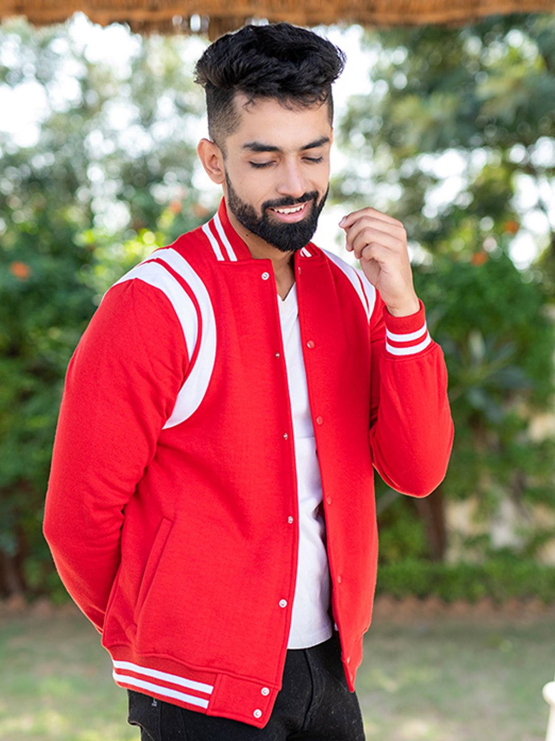 Get full Santa feels in this amazing Red Varsity Jacket! The bold colour looks very beautiful and adds a special feel to the jacket. The Red Varsity Jacket is made of high-quality cotton fabric that makes it a perfect part of your winter wardrobe! PRODUCT DESCRIPTIONFull Sleeves Side Pocket Embroidered